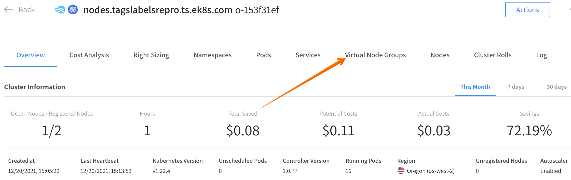 1. In your Ocean cluster, click the Virtual Node Groups tab.