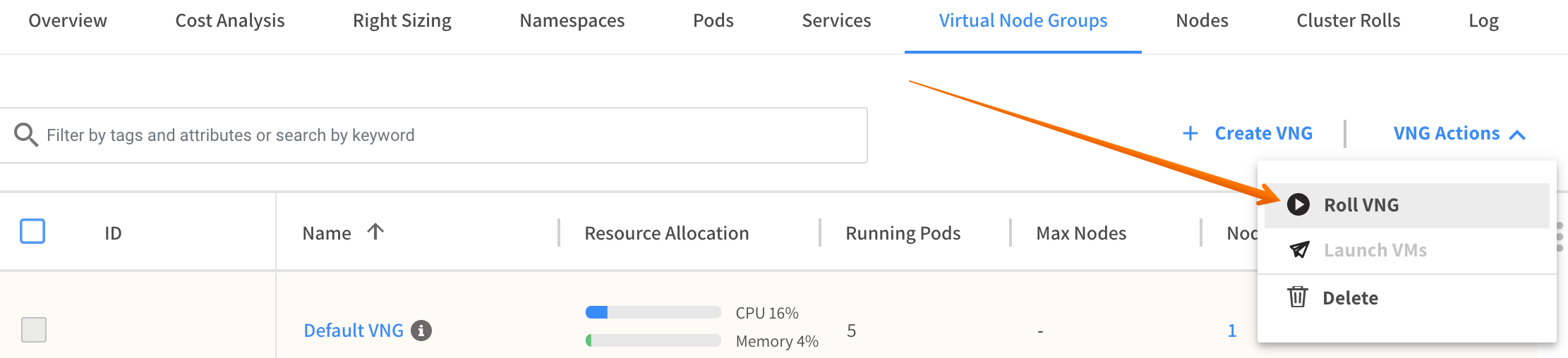 3. Click VNG Actions and Roll VNG.